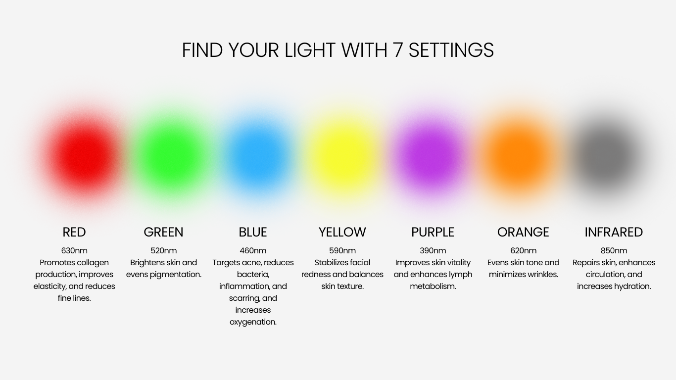 Orange (620nm): Evens skin tone and reduces wrinkles.